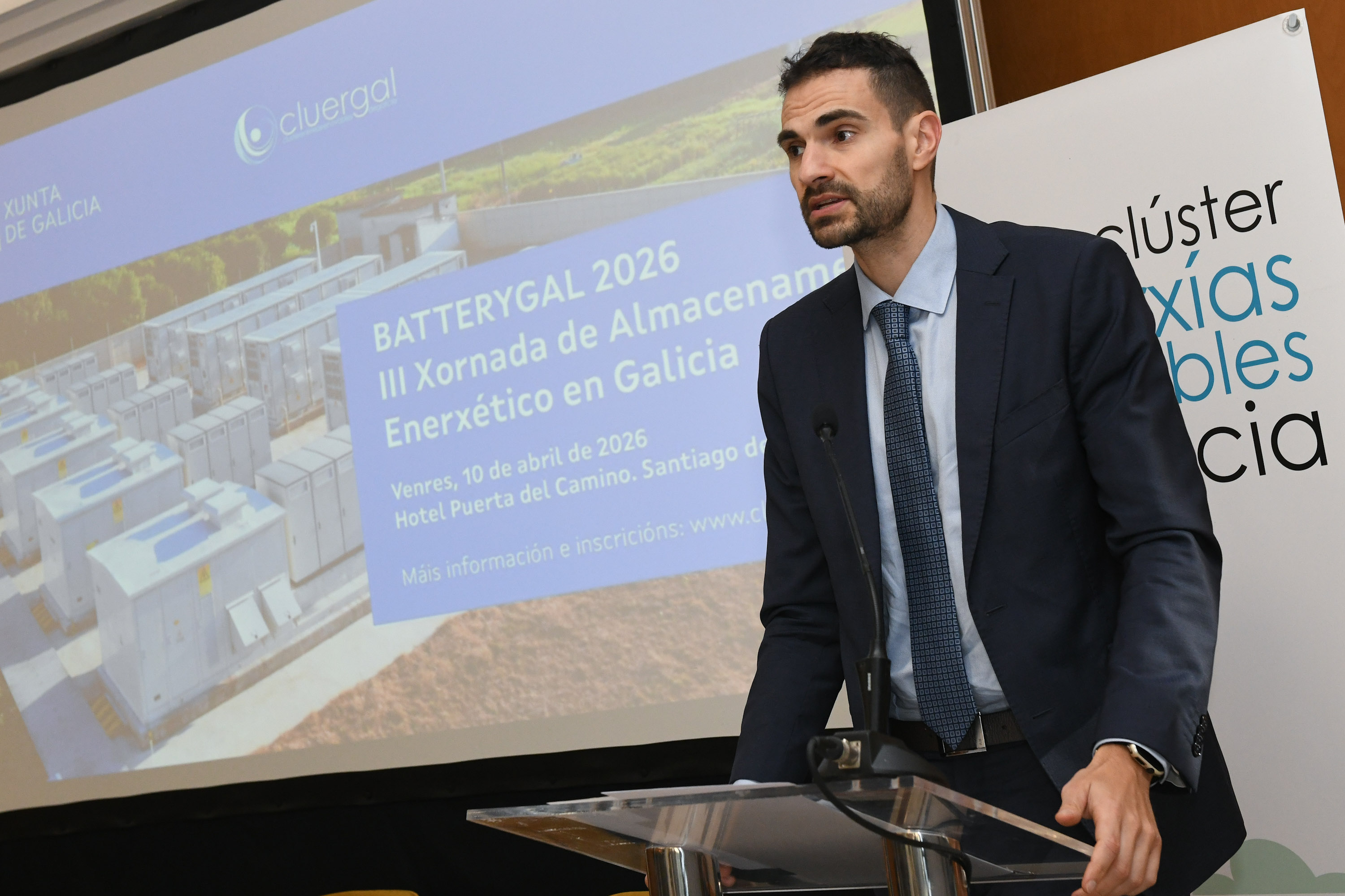 O director xeral de Planificación Enerxética e Minas, Pablo Fernández Vila, inaugura en Santiago o BatteryGal 2026 III Xornada de Almacenamento Enerxético en Galicia, organizada polo Clúster de Enerxías Renovables de Galicia (Cluergal)